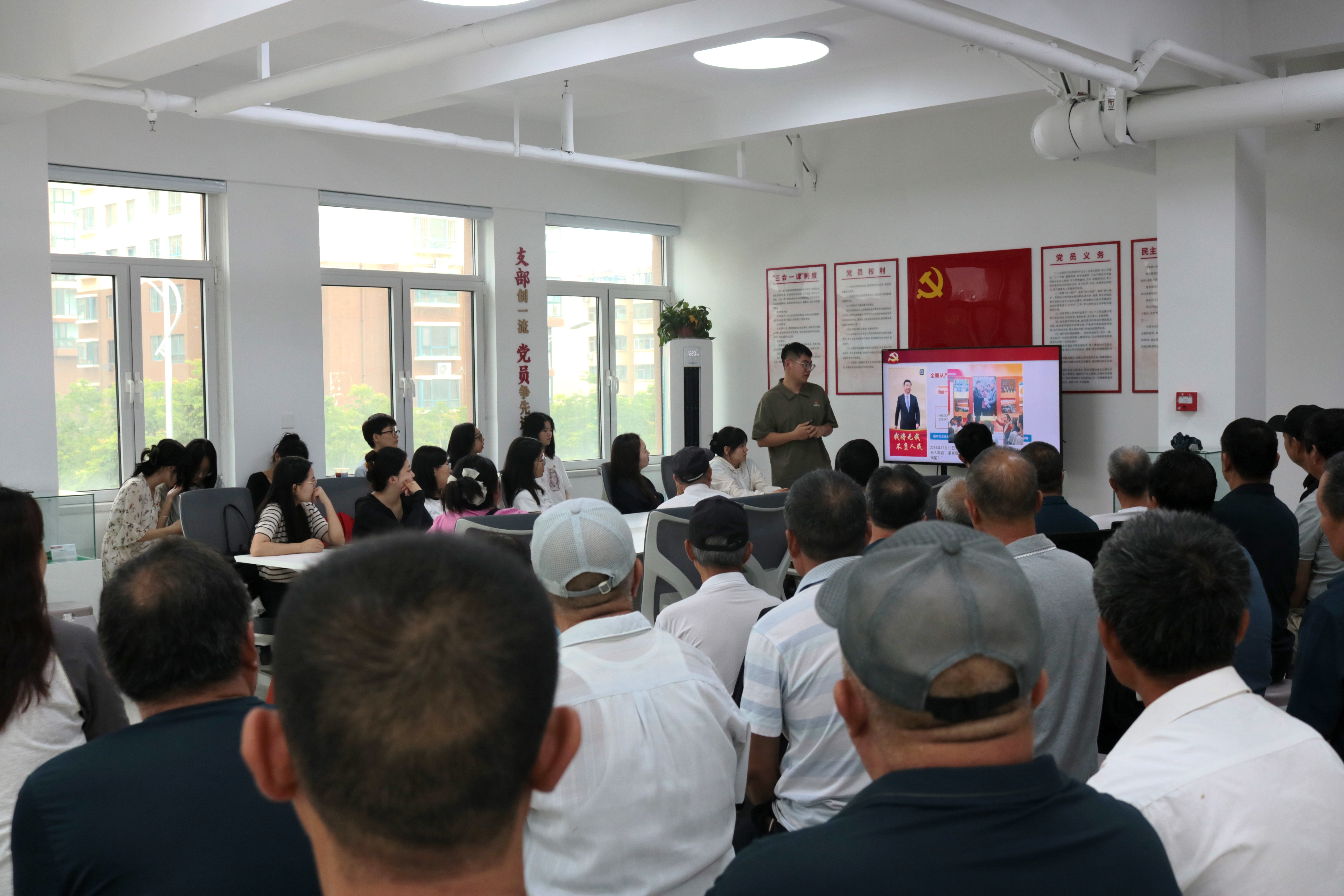 走訪結束后,全體人員一同來到社區黨群服務中心,參加海大馬院學生宣講團帶來的專題宣講——《薪火相傳弘揚延安精神,嚴明黨紀滋養政治靈魂》。宣講團通過回溯黨中央在延安十三年的光輝歷史,全面闡釋了延安精神的具體內涵,并注重從傳承性和時代性的角度理解延安精神,將延安整風運動與正在開展的黨紀學習教育相融合,以優秀黨史經驗指導基層學習教育工作,推動黨紀學習教育走深走實。