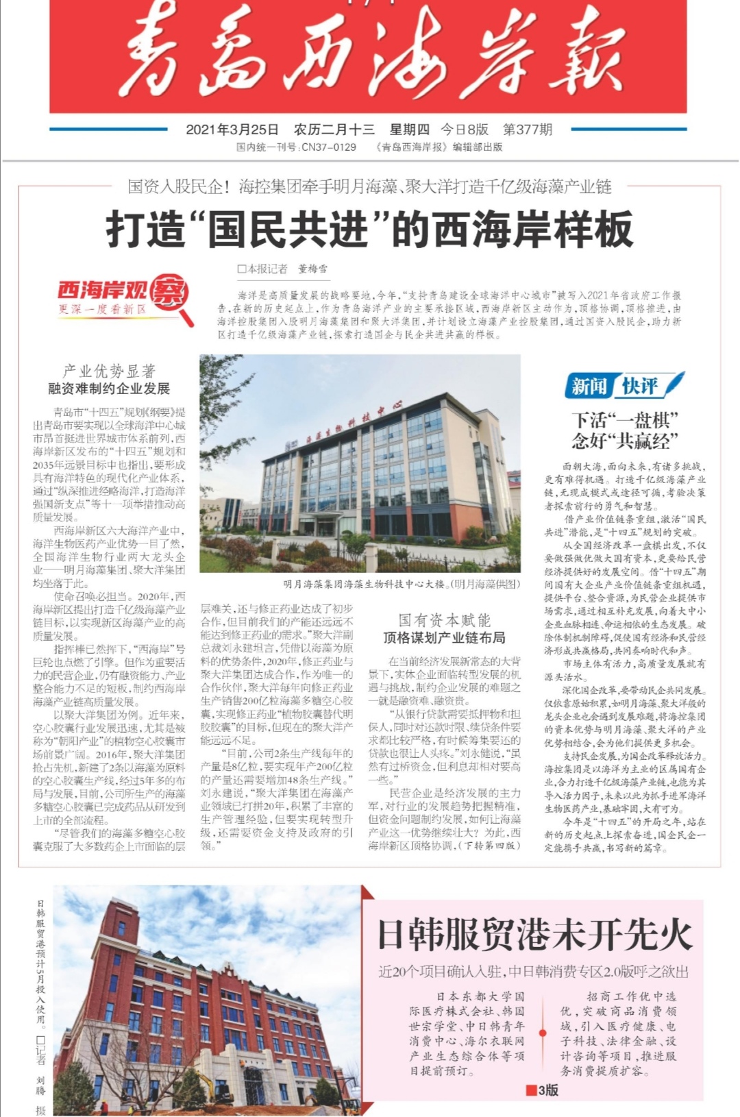 海洋是高質量發展的戰略要地,今年,“支持青島建設全球海洋中心城市”被寫入2021年省政府工作報告,在新的歷史起點上,作為青島海洋產業的主要承接區域,西海岸新區主動作為,頂格協調,頂格推進,由海洋控股集團入股明月海藻集團和聚大洋集團,并計劃設立海藻產業控股集團,通過國資入股民企,助力新區打造千億級海藻產業鏈,探索打造國企與民企共進共贏的樣板。